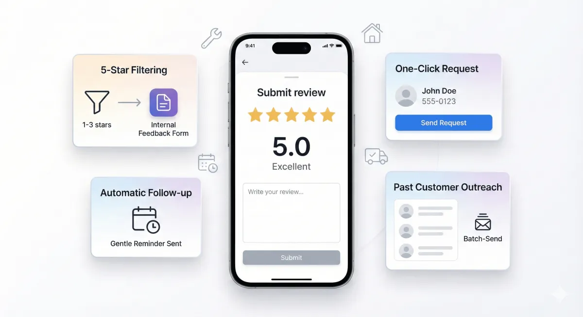 Most people forget to leave a review even when they intend to. The system sends gentle follow up messages over several weeks, spaced out so they feel natural and never overwhelming.
